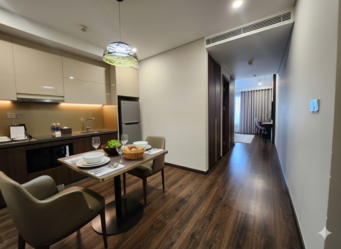 Immensed in the spacious space of the Premium apartment, guests will experience extreme relazation. In particular, all rooms have separate kitchen and living room, deliver a familiar feeling like living in your own apartment. Natural sunlight from the large glass window floods into the room to welcome the dawn, ready for a new productive working day.